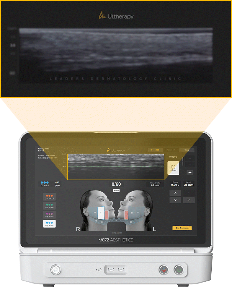 울쎄라피 프라임의 특허받은 실시간 초음파 영상 기술(DeepSee™)로 환자의 피부 깊이 및 구조를